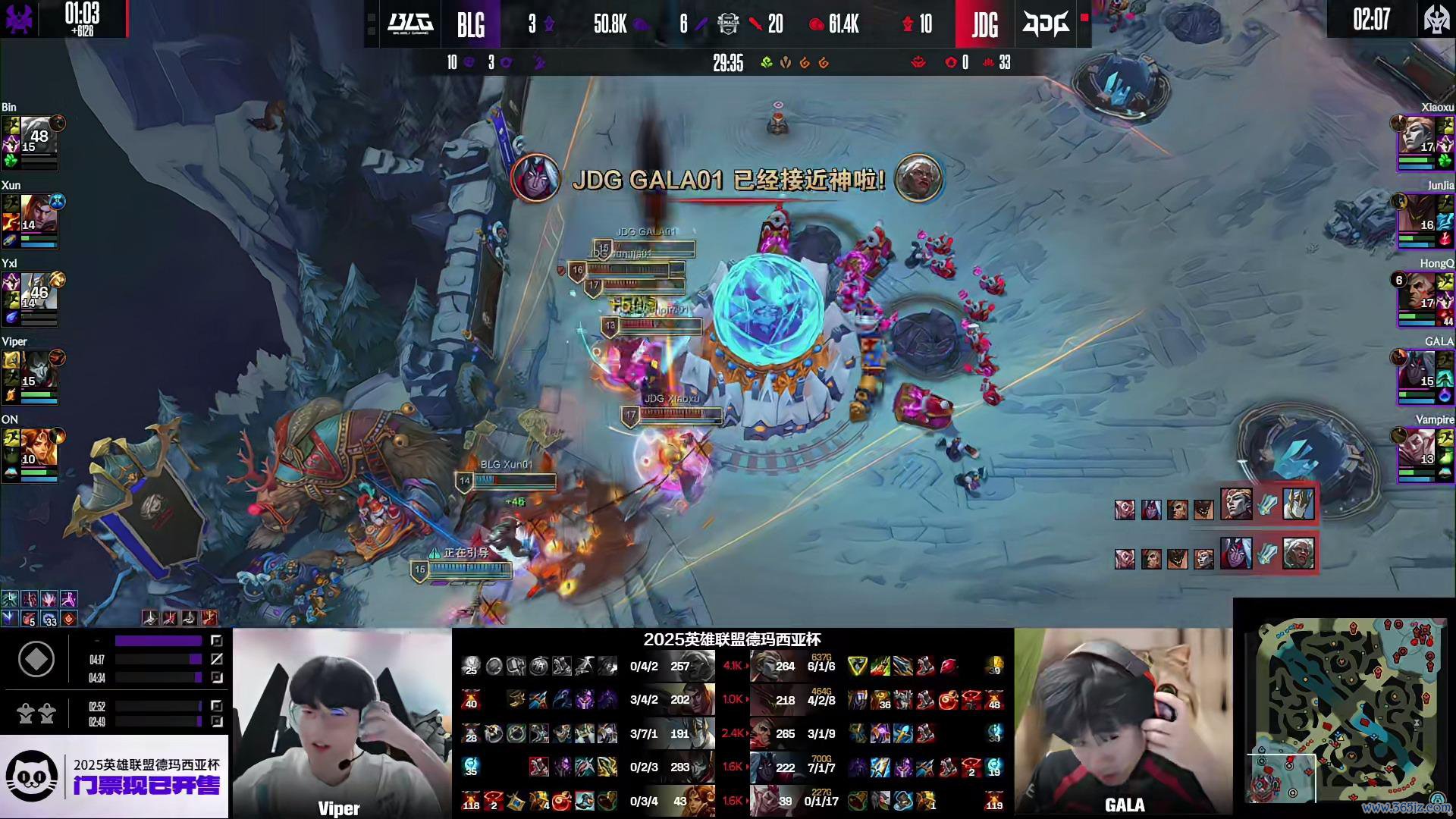 中期20分钟两边争夺小龙,junjia赵信抢下小龙,两边混战Viper芸阿娜最初被秒,JDG双C收割打出1换3后,拿下厄塔汗。28分钟Vampire锤石野区被击杀,BLG拿劣等一条大龙,随后混战JDG双C被秒,BLG打出0换3。后期36分钟JDG主动打大龙,Gala厄斐琉斯找契机秒掉Viper芸阿娜,JDG拿劣等二条大龙击杀BLG三东谈主。37分钟bin铁男关住junjia赵信,BLG拿下电龙魂,可是团战Gala厄斐琉斯收割,Viper芸阿娜被秒,JDG团灭BLG后,拿劣等一局的得胜。首局伤害最高的是HongQ沙皇,BLG这边伤害最高的是Viper芸阿娜。